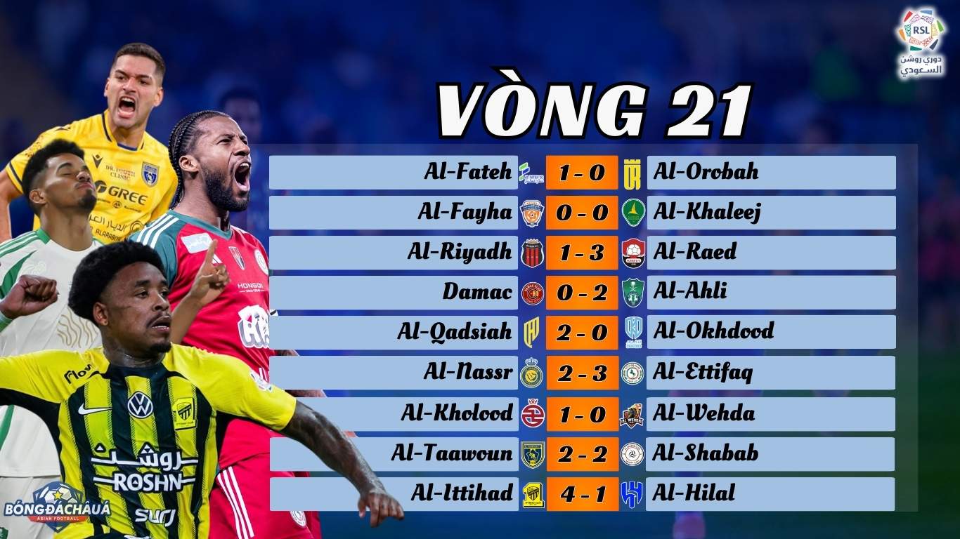 Những diễn biến hấp dẫn và kết quả bất ngờ tiếp tục xảy ra ở vòng 21 Saudi Pro League 2024/25. Ở vòng đấu này, Al Hilal đánh dấu trận đấu thứ ba liên tiếp không biết mùi chiến thắng, khi họ bị đại kình địch Al Ittihad vùi dập với tỉ số 4-1. Trong khi đó, Al Nassr có trận thua tức tưởi trước Al Ettifaq, qua đó để cho Al Qadisiya gia tăng ngắn cách biệt trên BXH.