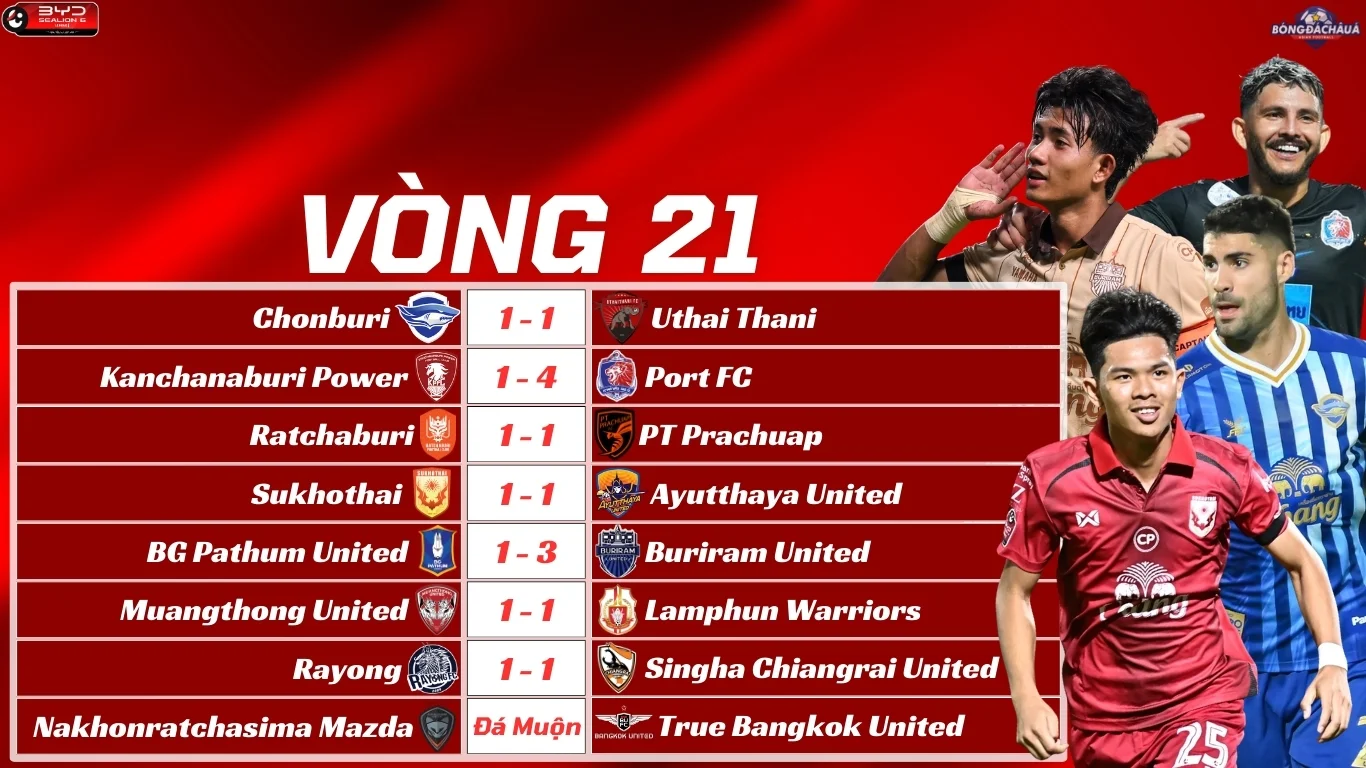Ở các trận đấu khác của vòng 21 Thai League 2025/26, bao gồm Chonburi gặp Uthai Thani, Ratchaburi FC gặp PT Prachuap FC, Sukhothai FC gặp Ayutthaya United, Muangthong United gặp Lamphun Warriors, và Rayong FC gặp Singha Chiangrai United, tất cả đều hòa nhau 1-1.