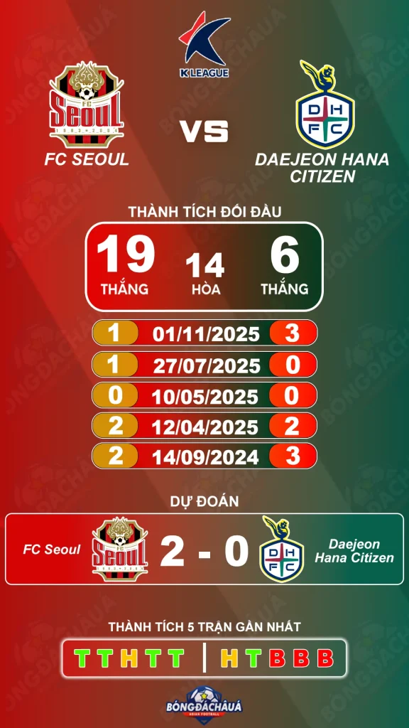 Trước một FC Seoul đang đạt phong độ cao và có sự cân bằng ở cả ba tuyến, Daejeon nhiều khả năng sẽ tiếp tục nhận thêm một thất bại. BongDaChauA dự đoán: FC Seoul 2-0 Daejeon.