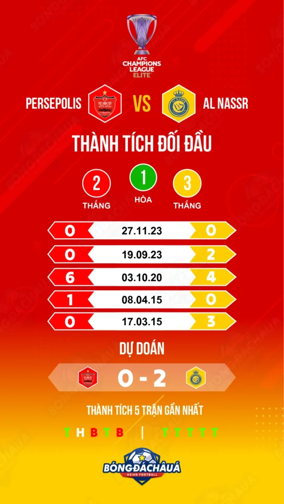 Dựa trên phong độ hiện tại, Al Nassr có vẻ như đang có phong độ và tâm lý tốt hơn nhiều so với Persepolis FC. Cả hai đội đều đang rất khát khao giành 3 điểm. Tuy nhiên, Persepolis FC có lợi thế khi được thi đấu trên sân nhà và có sự cổ vũ nhiệt tình từ người hâm mộ. Trong khi đó, Al Nassr sở hữu lực lượng cầu thủ chất lượng hơn và có lịch sử đối đầu nhỉnh hơn so với chủ nhà. Bóng Đá Châu Á dự đoán, với những lợi thế đó, Al Nassr có thể sẽ giành chiến thắng với tỷ số 2-0 trong trận đấu này.