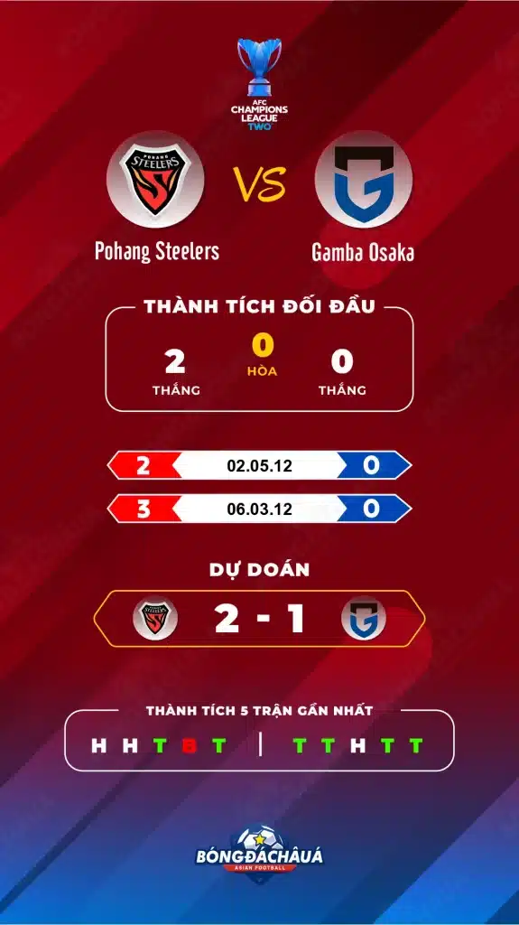 Dù Gamba Osaka sở hữu chuỗi toàn thắng, Pohang Steelers vẫn nắm giữ những cơ sở vững chắc để giành thắng lợi tại Steel Yard. Lịch sử đang nghiêng về đại diện Hàn Quốc khi trong 2 lần đối đầu gần nhất tại đấu trường châu lục, Pohang toàn thắng cả 2 trận (tổng tỷ số 5-0). Sức mạnh của Pohang nằm ở khả năng bóp nghẹt đối thủ bằng kỷ luật phòng ngự. Họ là đội duy nhất giữ sạch lưới 4/6 trận vòng bảng bảng H. Sự góp mặt của sát thủ Lee Ho-jae (người đóng góp 15 bàn mùa trước) sẽ là chìa khóa giải mã hàng thủ Gamba vốn chưa gặp nhiều thử thách thực sự tại bảng F. Với điểm tựa sân nhà và bản lĩnh của đội bóng từng 3 lần vô địch C1 châu Á, Bóng Đá Châu Á dự đoán Pohang đủ khả năng ngắt mạch thắng của đối thủ bằng một thắng lợi.