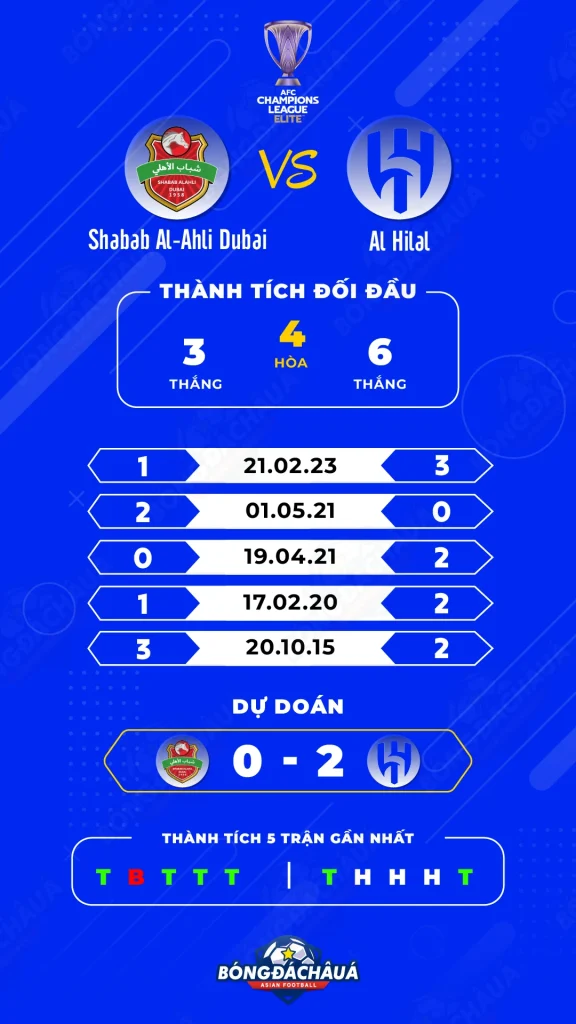 - Chuỗi phong độ 5 trận gần nhất, Shabab Al-Ahli Dubai thể hiện sự ổn định với 4 chiến thắng và 1 thất bại, còn về phía Al Hilal là nhịp thi đấu có phần trầm hơn với 2 chiến thắng và 3 trận hòa.