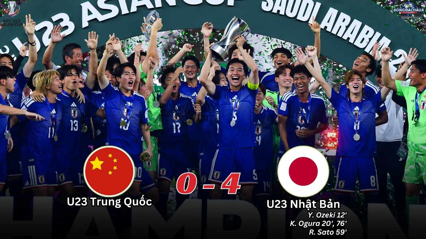 U23 Nhật Bản thể hiện phong độ hủy diệt khi đánh bại U23 Trung Quốc với tỷ số 4-0 trong trận chung kết AFC U23 Asian Cup 2026, diễn ra tối thứ Bảy tại SVĐ Prince Abdullah Al Faisal Sports City. Chiến thắng thuyết phục này giúp Nhật Bản trở thành đội tuyển đầu tiên bảo vệ thành công chức vô địch và nâng cao chiếc cúp lần thứ ba trong lịch sử.